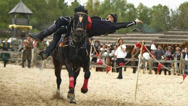 Найкращі українські кінні каскадери показали небезпечні трюки на фестивалі "Кентаври" у Києві. Вершники їздили догори ногами, задом наперед і перестрибували коня на скаку – і все це на шаленій швидкості. Так каскадери відроджують козацькі бойові традиції. Чим вражали українські каскадери – дивіться у відеосюжеті. +Відео