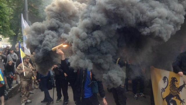 У Києві відбувається масштабний марш азовців, які протестують проти виборів на Донбасі. Активісти вирушили колоною до Верховної Ради. Журналіст Олексій Мацука у своєму Facebook опублікував фото, на якому видно активістів і автобуси, на яких, за словами журналіста, їх і привезли на акцію. Він також зауважив, що на цьому мітингу азовців досі не помітив прапора України, а видніються лише прапори з символікою "Азову". Під час ходи радикально налаштовані молодики почали палити фаєри і кидати їх куди попало. Один з таких запалених фаєрів потрапив під автомобіль, припаркований біля Лаври.2 3