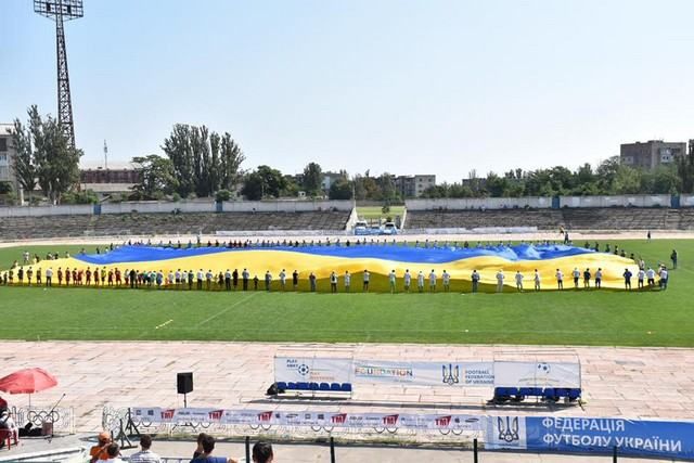 Найбільший у світі прапор України розміром 40 на 60 метрів розгорнули на стадіоні "Кристал" у Херсоні. Як повідомляє прес-служба Херсонської ОДА, привезли його в рамках чемпіонату з футболу "Крим – це Україна". Зазначається, що прапор тримали щонайменше 200 уболівальників і спортсменів. Цей прапор повністю відповідає реальному: його пропорції становлять 2:3 і його зареєстрували у Книзі рекордів України. Раніше стяг об'їхав всю країну, а вперше його розгорнули в Маріуполі, коли місто звільнили від окупантів.2 3