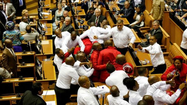 У ПАР під час виступу президента депутати затіяли масову бійку прямо в залі парламенту. Штовханина почалась, коли члени опозиції спробували перешкодити виступу президента країни Джейкоба Зуми, пише ВВС. Члени радикальної партії "Борці за економічну свободу", одягнені в червоне, близько години освистували лідера країни і таким чином не давали йому можливості продовжити виступ. Вони звинувачують президента ПАР Джейкоба Зуму в корупції та кумівстві та у погіршення економічної ситуації в країні. Пізніше охоронці спробували їх вивести із зали засідань. Тоді й спалахнула масова бійка.2 3