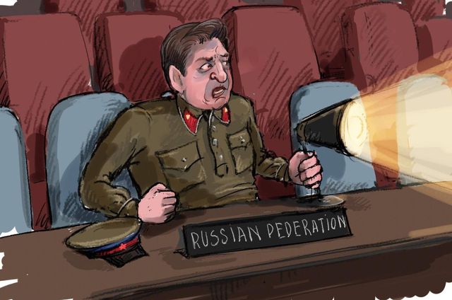 Художник Георгій Ключник у карикатурі зобразив власне бачення провокативної поведінки на засіданні Ради безпеки ООН російського постпреда Володимира Сафронкова. Сафронкова, який "відзначився" грубим порушенням дипломатичного етикету, Ключник зобразив у військовій формі. "Подивися на мене, очі-то не відводь, що ти очі відводиш?", – сказав Сафронков до колеги з Великобританії Меттью Райкрофта під час обговорення ситуації в Сирії.2 3