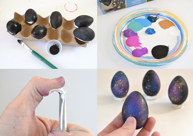 Окремо нанесіть на картон "космічні кольори". Для прикладу, фіолетовий, синій, голубий, золотистий, білий тощо. Оберіть один колір та розпорошіть його на яйце. Це можна робити або пензликом або навіть старою зубною щіткою. Проте наносьте інший колір тільки після того, як висохне попередній шар.